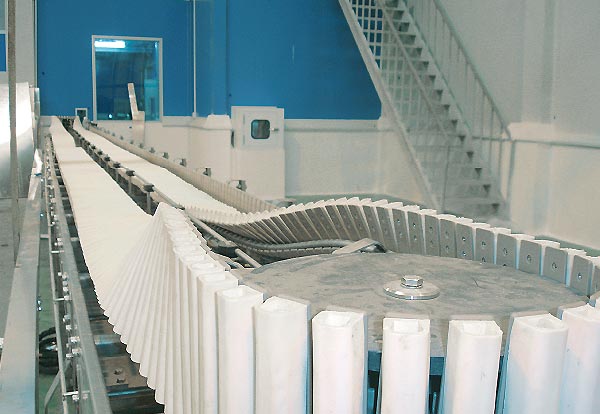 實瓶輸送系統是中浩機械根據用戶廠房情況,量身定制風送系統,合理運用無壓力輸送、自動分瓶器等設備,達到生產過程中不卡瓶、不擠瓶、不倒瓶,有效提高生產線的運行