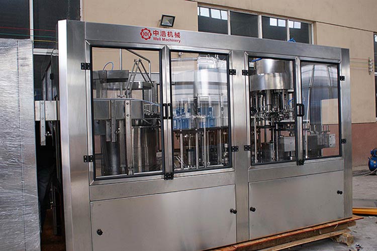 飲用水三合一灌裝機主要用于飲料的灌裝作業。三合一灌裝機將沖洗、灌裝、旋蓋三種功能合在一個機體上,全過程實現自動化,適用于聚酯瓶、塑料瓶灌裝飲用水、蘇打水、礦泉水、純凈水、果汁等。各部分的適用瓶型調整采用手柄轉動實現,輕松自如,簡便快捷。
