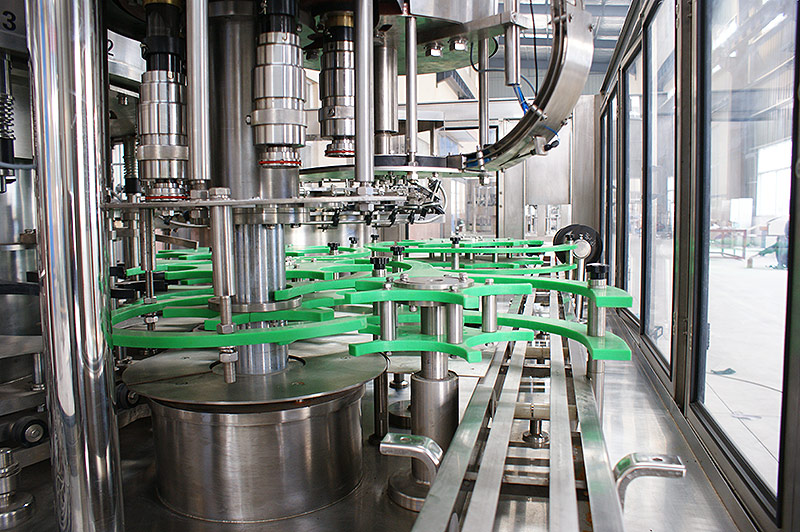 純凈水灌裝機械采用了大量的新技術、新工藝、新結構,產品質量處于同行業先進水平。其特點是瓶子的頸部卡在星輪形板的卡瓶板與上形板之間,由星輪傳動帶動卡瓶板轉動而實現瓶子的傳送,從而實現全自動洗瓶、灌裝、封蓋三大工序的,具有瓶子磨損小、瓶型更換簡單、傳動準確平穩、工藝流程科學等優點。此外,本純凈水灌裝設備所有與液體接觸的零部件全部采用進口優質不銹鋼材料或耐磨、耐臭氧、食品級工程塑料,電氣系統多數選用進口元件,食品衛生條件符合國家標準,性能穩定可靠,設備故障率低,實現全自動化控制,并且有完善的售后服務,深受國內外用戶普遍歡迎,是各類軟飲料生產企業選擇的理想灌裝設備。