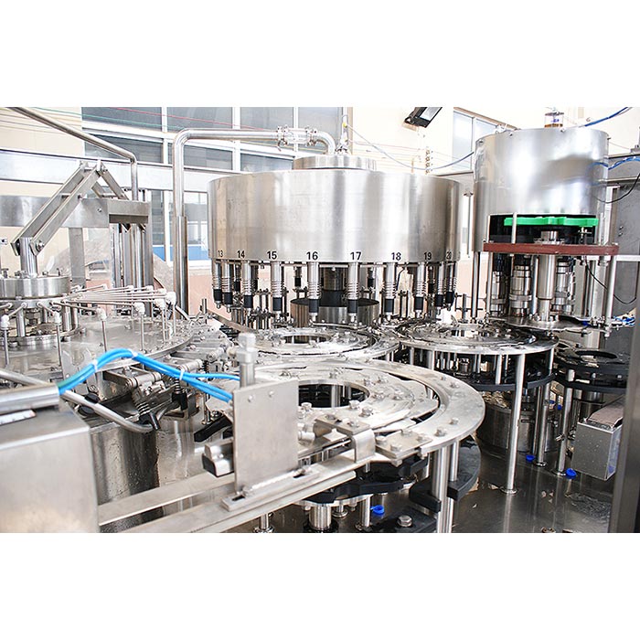 三合一礦泉水灌裝機將沖洗、灌裝、旋蓋三種功能合在一個機體上,全過程實現自動化,適用于聚酯瓶、塑料瓶灌裝礦泉水、蘇打水、飲用水等。