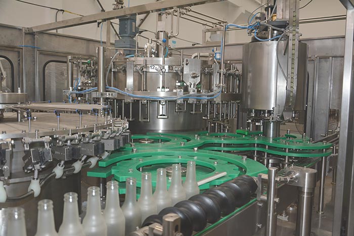 含汽飲料灌裝設備是中浩機械根據飲料灌裝工藝要求,引進、消化、吸收國外技術為基礎,創新研發而成的一種具有先進水平的等壓灌裝設備,采用風送道與進瓶撥輪直連技術